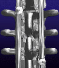 stainless steel rods, hooks, and a bone graft. The rods are attached to the spine with